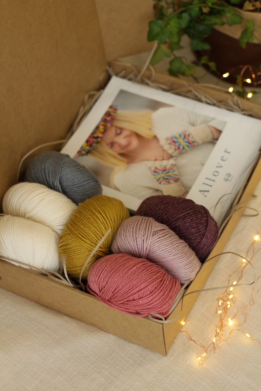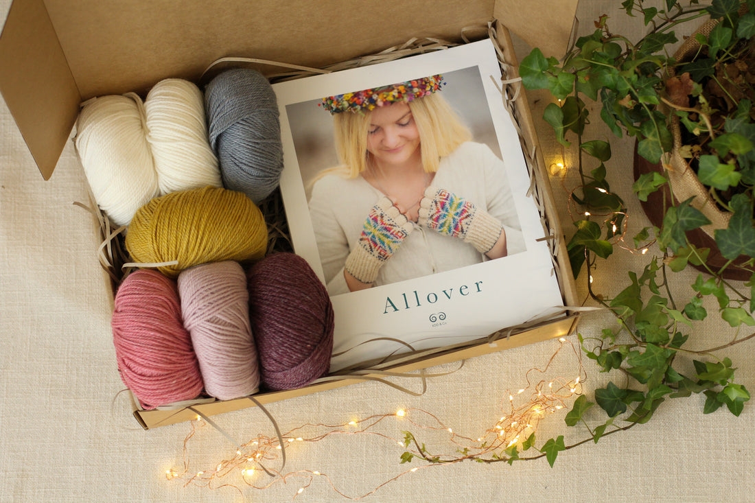 The Colourwork Knitter's Gift Set is ideal for those who love stranded knitting. This set features Allover, a beautiful collection of 14 knitting patterns from Scottish knitwear designer Kate Davies, and a selection of soft organic wool yarns to knit the hot water bottle from the book.