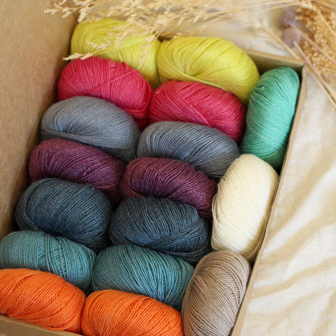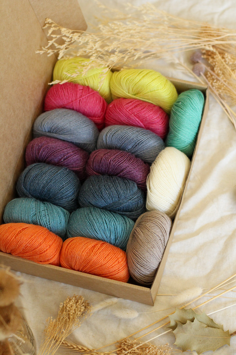 Packaged in a Kraft gift box, the Ultimate Sock Knitter's Box includes enough yarn to knit at least 7 pairs of socks + 3 additional balls to mix and match for contrasts.