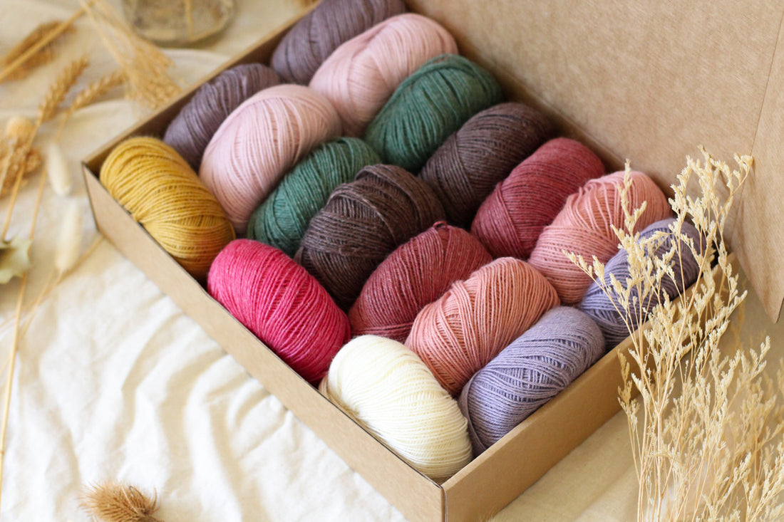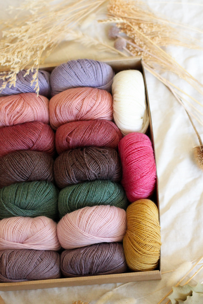 Packaged in a Kraft gift box, the Ultimate Sock Knitter's Box includes enough yarn to knit at least 7 pairs of socks + 3 additional balls to mix and match for contrasts.